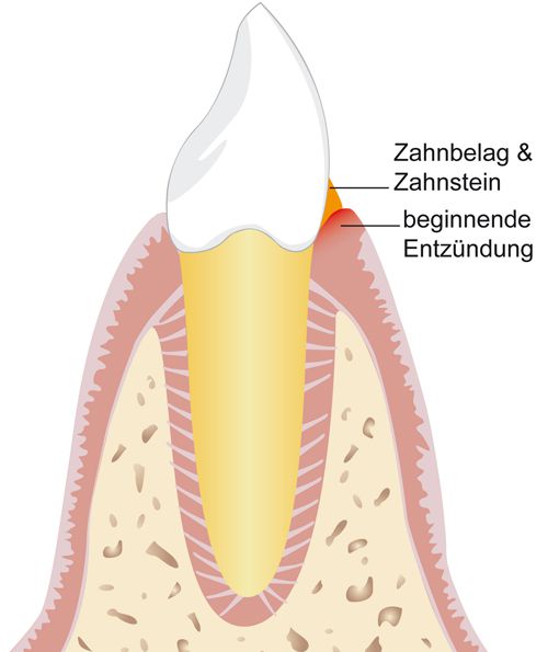 Eine Parodontitis beginnt meist mit einer harmlosen Zahnfleischentzündung. Wenn diese frühzeitig erkannt und behandelt wird, heilt sie oft problemlos aus. Ohne Behandlung können die Bakterien sich jedoch weiter ausbreiten und größere Bereiche des Zahnfleisches und den gesamten Zahnhalteapparat entzünden. Im weiteren Verlauf wird dann in der Regel der Kieferknochen geschädigt und der Zahn verliert seinen Halt. Damit ist er gefährdet, obwohl er selbst völlig gesund ist.