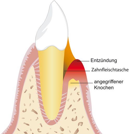 Charakteristisch für eine parodontale Erkrankung ist die Bildung so genannter Zahnfleischtaschen: Gesundes Zahnfleisch umschließt den Zahn und liegt dicht am Zahnhals an; dadurch wird der Zahnhalteapparat vor den zahlreich im Mundraum vorhandenen Bakterien geschützt. Bei einer Parodontitis bildet sich zwischen Zahn und Zahnfleisch ein Spalt, der als Zahnfleischtasche bezeichnet wird. Diese Tasche kann durch die tägliche Zahnpflege nicht erreicht und gereinigt werden. Die Folge: Bakterien finden hier einen optimalen Lebensraum, können sich darin verstärkt vermehren und weitere Teile des Halteapparates schädigen.